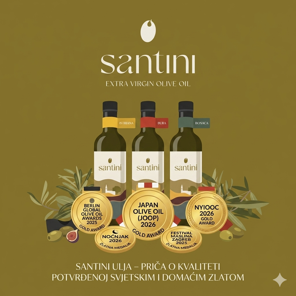 Iste godine, značajan uspjeh ostvaren je i na Olio delle Sirene 2026 u Sorrentu, gdje se Santini ulje plasiralo u veliko finale među oko 400 uzoraka iz Italije, Hrvatske, Slovenije, Grčke i Turske. Ulazak u završnicu ovakvog natjecanja potvrđuje visoku razinu kvalitete i konkurentnosti na međunarodnoj sceni.